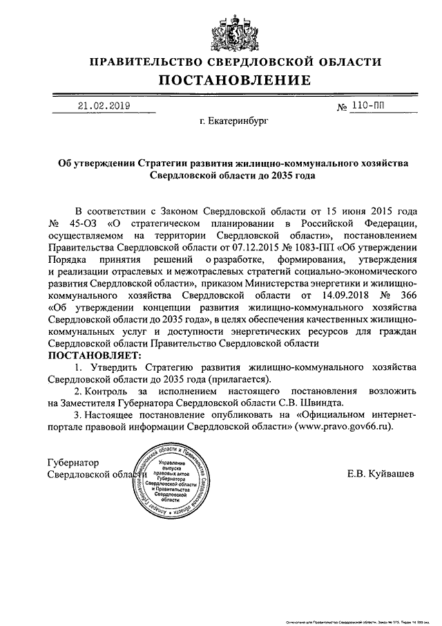 Постановление Правительства Свердловской области от 21.02.2019 N 110-ПП "Об утверждении Стратегии развития жилищно-коммунального хозяйства Свердловской области до 2035 года"