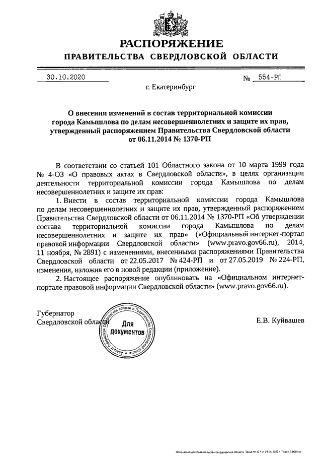 Распоряжение Правительства Свердловской области от 30.10.2020 N 554-РП "О внесении изменений в состав территориальной комиссии города Камышлова по делам несовершеннолетних и защите их прав, утвержденный распоряжением Правительства Свердловской области от 06.11.2014 N 1370-РП"