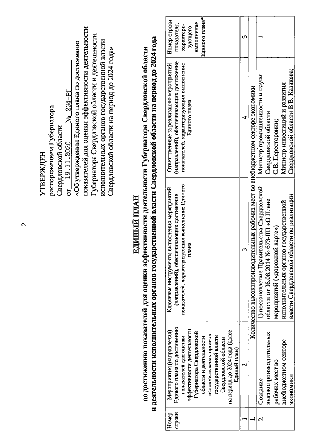 Распоряжение Губернатора Свердловской области от 19.11.2020 N 234-РГ "Об утверждении Единого плана по достижению показателей для оценки эффективности деятельности Губернатора Свердловской области и деятельности исполнительных органов государственной власти Свердловской области на период до 2024 года"