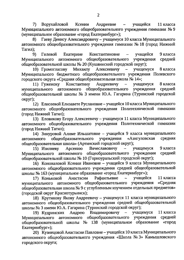 Распоряжение Губернатора Свердловской области от 30.10.2020 N 222-РГ "О присуждении премии Губернатора Свердловской области для учащихся общеобразовательных организаций, расположенных на территории Свердловской области, проявивших выдающиеся способности в интеллектуальной, спортивной, социально значимой и творческой деятельности, за 2019/2020 учебный год"