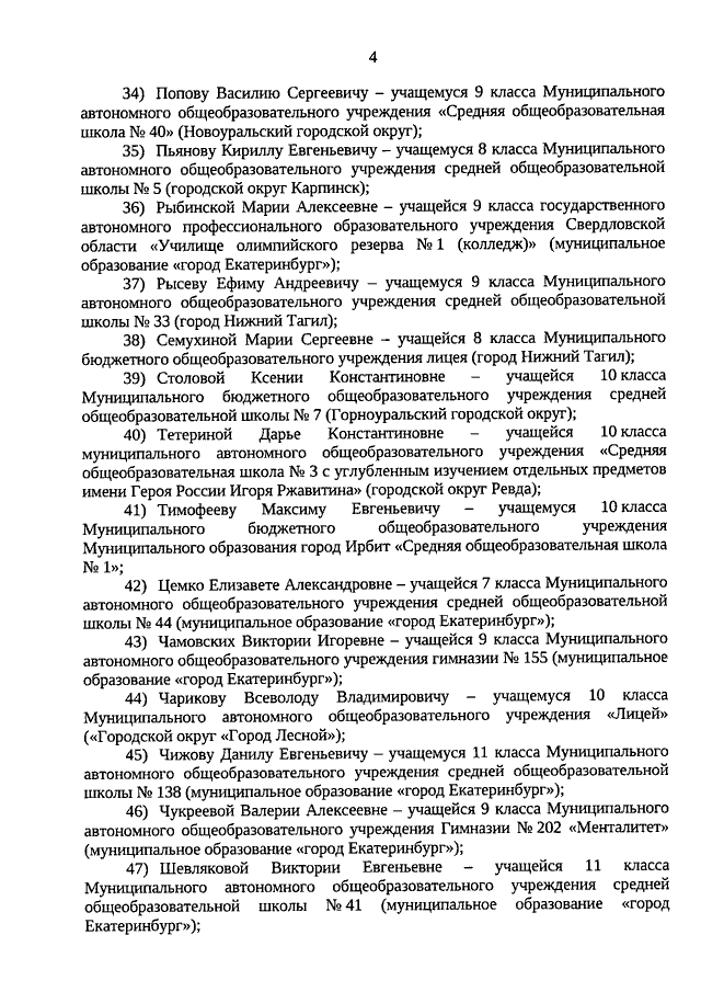Распоряжение Губернатора Свердловской области от 30.10.2020 N 222-РГ "О присуждении премии Губернатора Свердловской области для учащихся общеобразовательных организаций, расположенных на территории Свердловской области, проявивших выдающиеся способности в интеллектуальной, спортивной, социально значимой и творческой деятельности, за 2019/2020 учебный год"