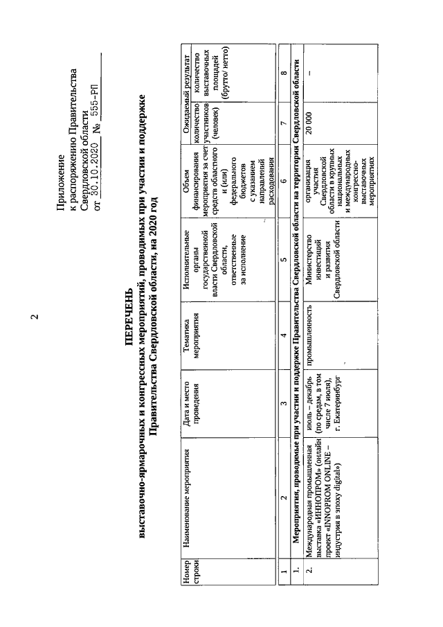 Распоряжение Правительства Свердловской области от 30.10.2020 N 555-РП "О внесении изменений в Перечень выставочно-ярмарочных и конгрессных мероприятий, проводимых при участии и поддержке Правительства Свердловской области, на 2020 год, утвержденный распоряжением Правительства Свердловской области от 10.01.2020 N 1-РП"
