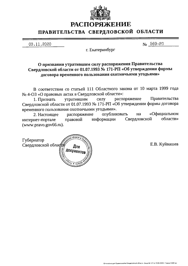 Распоряжение Правительства Свердловской области от 03.11.2020 N 569-РП "О признании утратившим силу распоряжения Правительства Свердловской области от 01.07.1993 N 171-РП "Об утверждении формы договора временного пользования охотничьими угодьями"