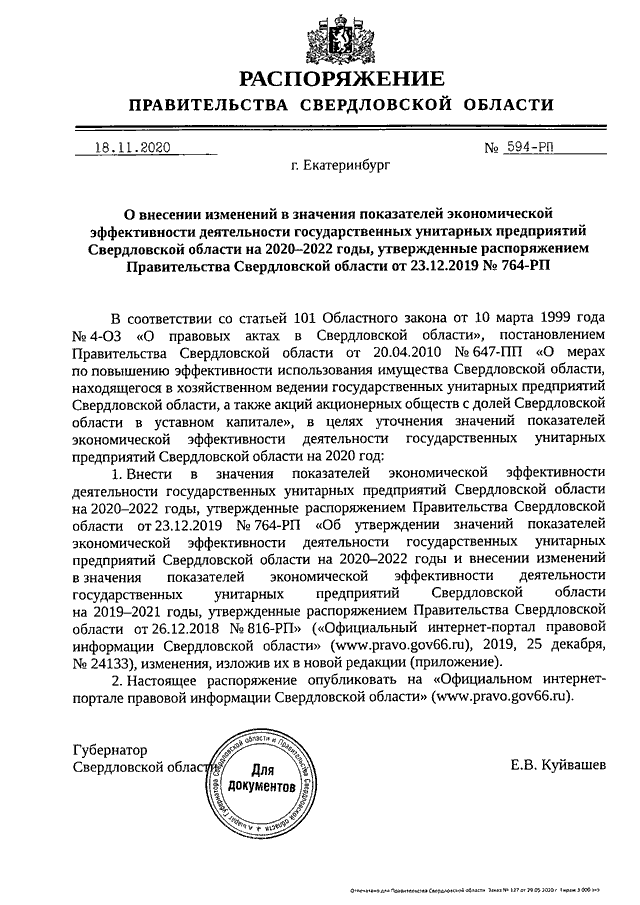 Распоряжение Правительства Свердловской области от 18.11.2020 N 594-РП "О внесении изменений в значения показателей экономической эффективности деятельности государственных унитарных предприятий Свердловской области на 2020 - 2022 годы, утвержденные распоряжением Правительства Свердловской области от 23.12.2019 N 764-РП"