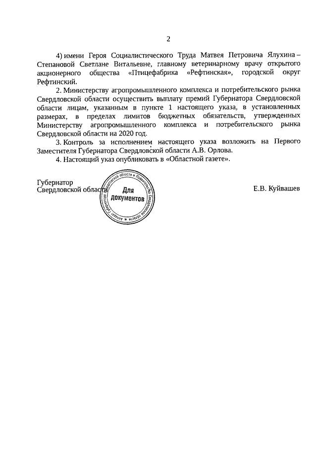 Указ Губернатора Свердловской области от 30.10.2020 N 598-УГ "О присуждении премий Губернатора Свердловской области имени Героев Социалистического Труда Сергея Васильевича Еремеева, Ефима Федосеевича Маркина, Евгения Константиновича Ростецкого и Матвея Петровича Ялухина для работников агропромышленного комплекса Свердловской области"