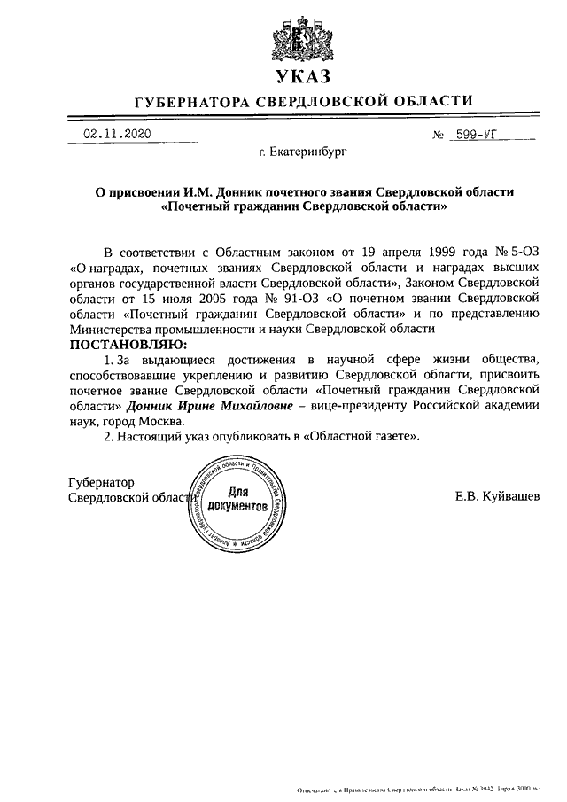 Указ Губернатора Свердловской области от 02.11.2020 N 599-УГ "О присвоении И.М. Донник почетного звания Свердловской области "Почетный гражданин Свердловской области"