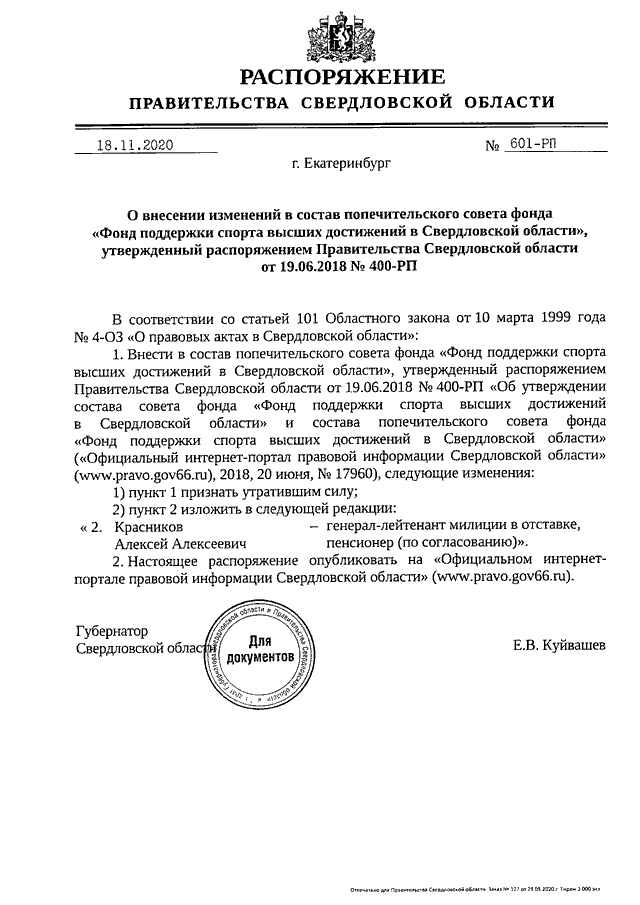 Распоряжение Правительства Свердловской области от 18.11.2020 N 601-РП "О внесении изменений в состав попечительского совета фонда "Фонд поддержки спорта высших достижений в Свердловской области", утвержденный распоряжением Правительства Свердловской области от 19.06.2018 N 400-РП"