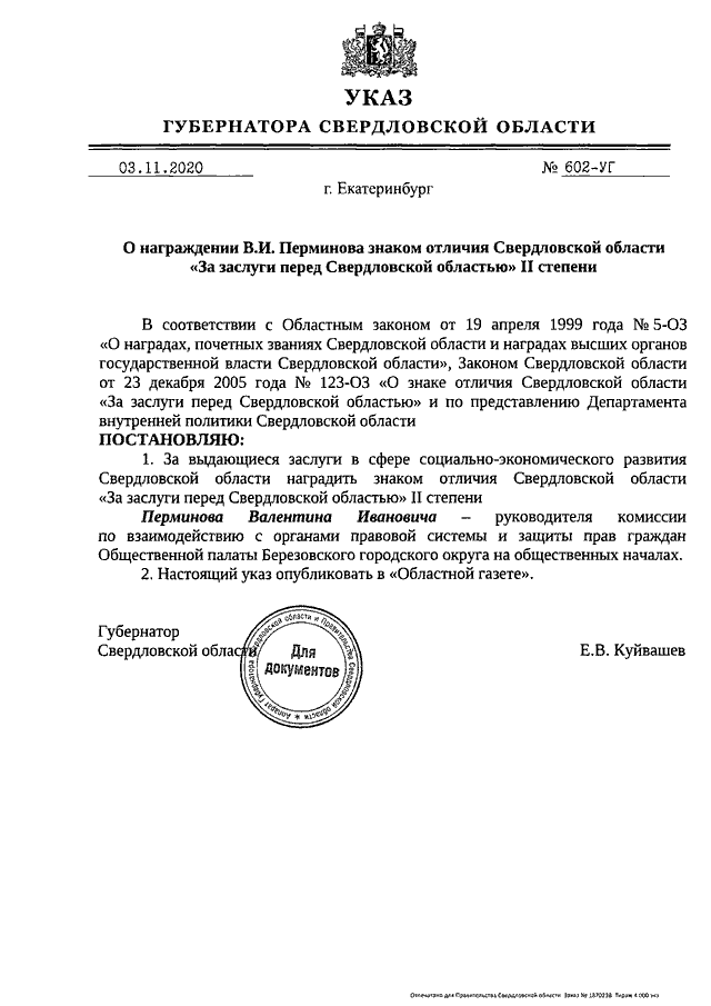 Указ Губернатора Свердловской области от 03.11.2020 N 602-УГ "О награждении В.И. Перминова знаком отличия Свердловской области "За заслуги перед Свердловской областью" II степени"