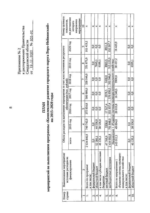Распоряжение Правительства Свердловской области от 19.11.2020 N 603-РП "О внесении изменений в программу "Комплексное развитие городского округа Верх-Нейвинский" на 2015 - 2020 годы, утвержденную распоряжением Правительства Свердловской области от 31.07.2015 N 820-РП"
