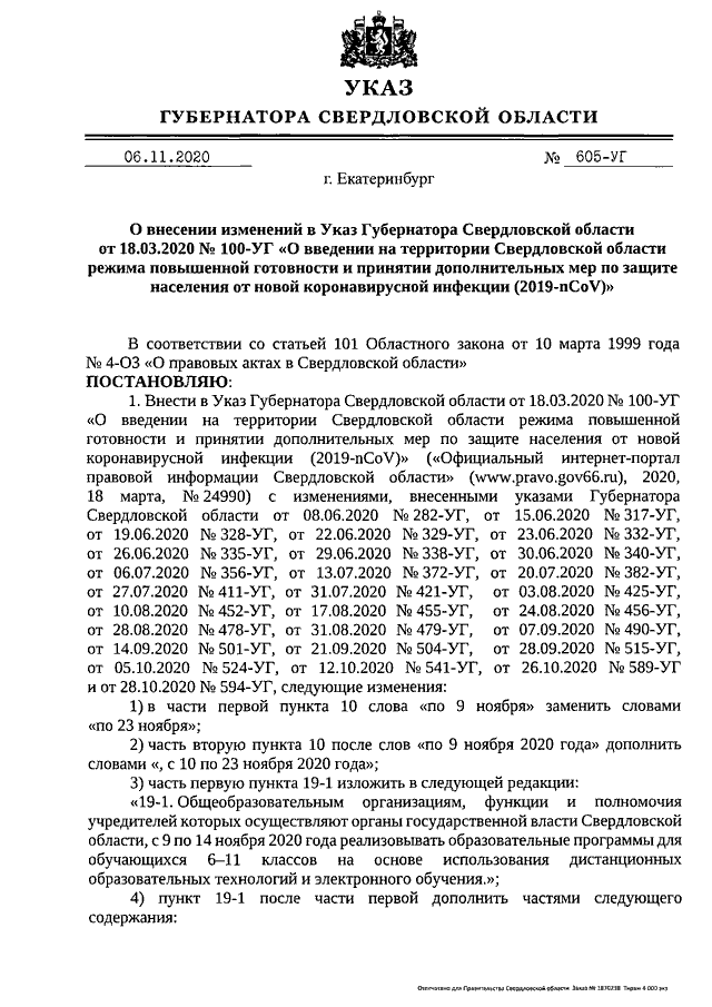 Указ Губернатора Свердловской области от 06.11.2020 N 605-УГ "О внесении изменений в Указ Губернатора Свердловской области от 18.03.2020 N 100-УГ "О введении на территории Свердловской области режима повышенной готовности и принятии дополнительных мер по защите населения от новой коронавирусной инфекции (2019-nCoV)"