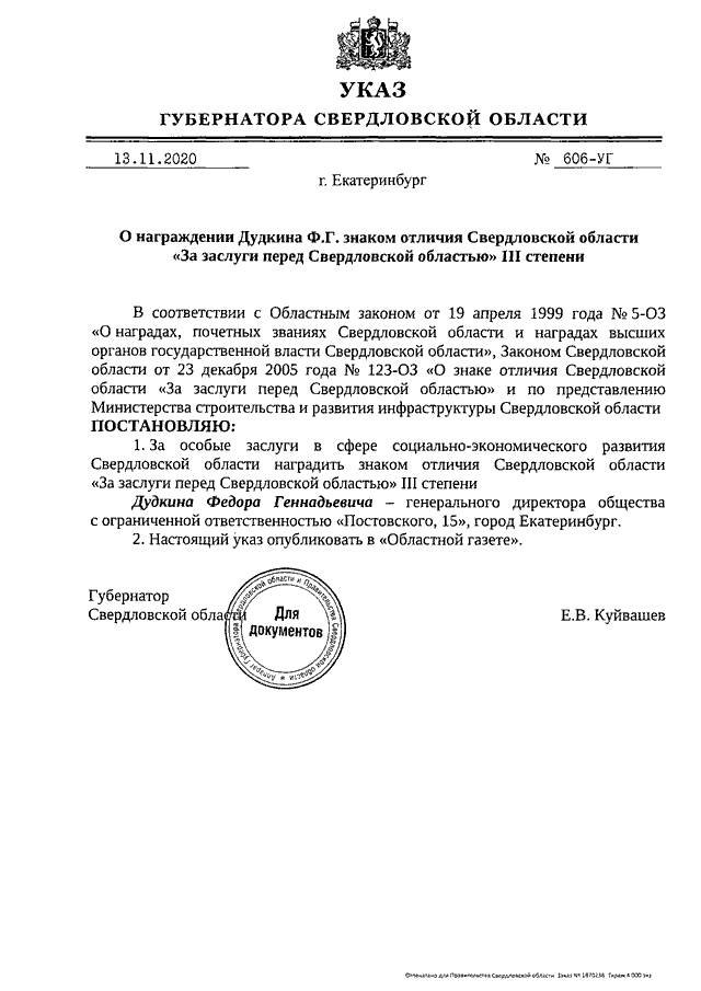 Указ Губернатора Свердловской области от 13.11.2020 N 606-УГ "О награждении Дудкина Ф.Г. знаком отличия Свердловской области "За заслуги перед Свердловской областью" III степени"