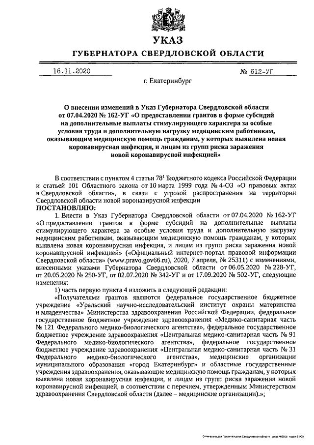 Указ Губернатора Свердловской области от 16.11.2020 N 612-УГ "О внесении изменений в Указ Губернатора Свердловской области от 07.04.2020 N 162-УГ "О предоставлении грантов в форме субсидий на дополнительные выплаты стимулирующего характера за особые условия труда и дополнительную нагрузку медицинским работникам, оказывающим медицинскую помощь гражданам, у которых выявлена новая коронавирусная инфекция, и лицам из групп риска заражения новой коронавирусной инфекцией"