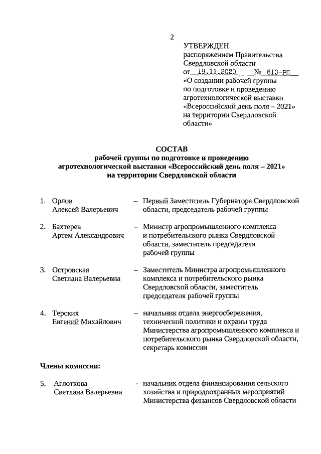 Распоряжение Правительства Свердловской области от 19.11.2020 N 613-РП "О создании рабочей группы по подготовке и проведению агротехнологической выставки "Всероссийский день поля - 2021" на территории Свердловской области"