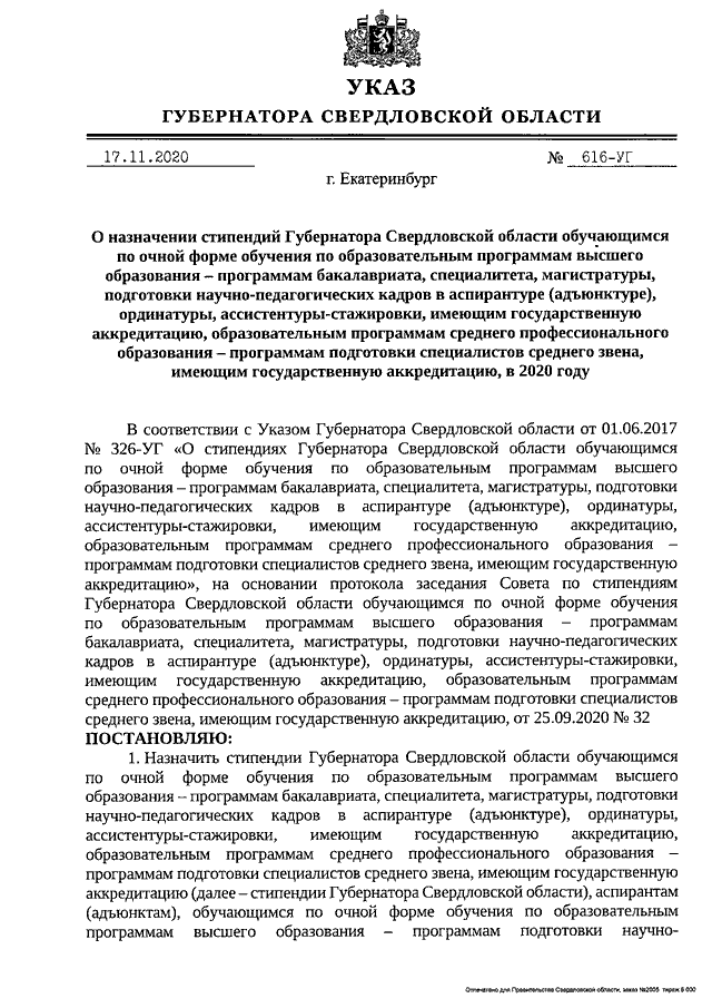 Указ Губернатора Свердловской области от 17.11.2020 N 616-УГ "О назначении стипендий Губернатора Свердловской области обучающимся по очной форме обучения по образовательным программам высшего образования - программам бакалавриата, специалитета, магистратуры, подготовки научно-педагогических кадров в аспирантуре (адъюнктуре), ординатуры, ассистентуры-стажировки, имеющим государственную аккредитацию, образовательным программам среднего профессионального образования - программам подготовки специалистов среднего звена, имеющим государственную аккредитацию, в 2020 году"