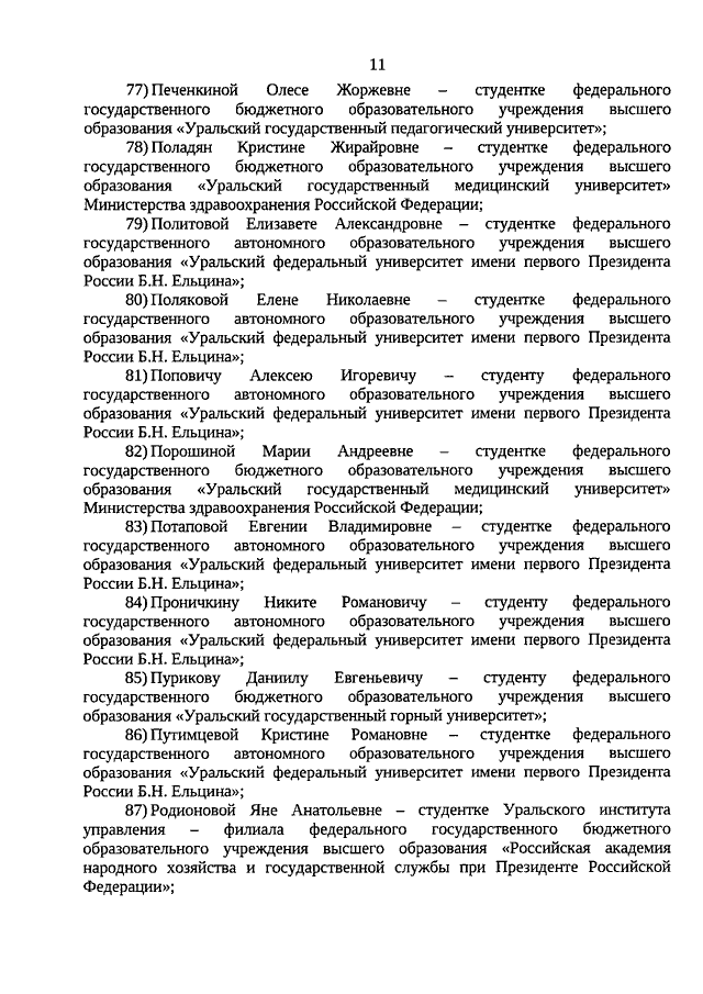 Указ Губернатора Свердловской области от 17.11.2020 N 616-УГ "О назначении стипендий Губернатора Свердловской области обучающимся по очной форме обучения по образовательным программам высшего образования - программам бакалавриата, специалитета, магистратуры, подготовки научно-педагогических кадров в аспирантуре (адъюнктуре), ординатуры, ассистентуры-стажировки, имеющим государственную аккредитацию, образовательным программам среднего профессионального образования - программам подготовки специалистов среднего звена, имеющим государственную аккредитацию, в 2020 году"