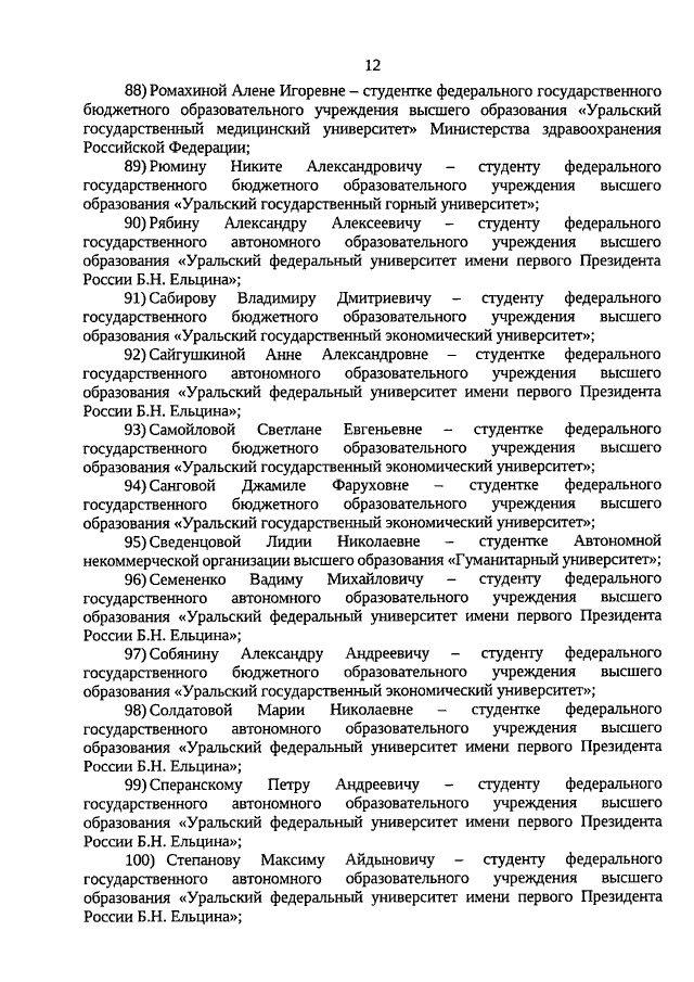 Указ Губернатора Свердловской области от 17.11.2020 N 616-УГ "О назначении стипендий Губернатора Свердловской области обучающимся по очной форме обучения по образовательным программам высшего образования - программам бакалавриата, специалитета, магистратуры, подготовки научно-педагогических кадров в аспирантуре (адъюнктуре), ординатуры, ассистентуры-стажировки, имеющим государственную аккредитацию, образовательным программам среднего профессионального образования - программам подготовки специалистов среднего звена, имеющим государственную аккредитацию, в 2020 году"