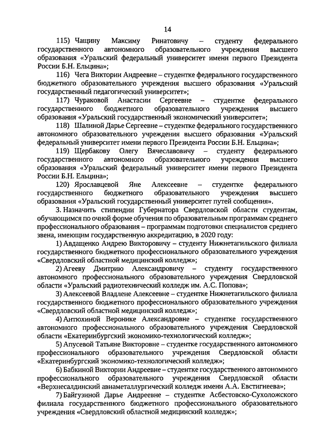 Указ Губернатора Свердловской области от 17.11.2020 N 616-УГ "О назначении стипендий Губернатора Свердловской области обучающимся по очной форме обучения по образовательным программам высшего образования - программам бакалавриата, специалитета, магистратуры, подготовки научно-педагогических кадров в аспирантуре (адъюнктуре), ординатуры, ассистентуры-стажировки, имеющим государственную аккредитацию, образовательным программам среднего профессионального образования - программам подготовки специалистов среднего звена, имеющим государственную аккредитацию, в 2020 году"