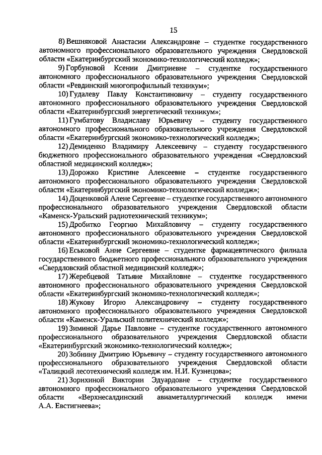 Указ Губернатора Свердловской области от 17.11.2020 N 616-УГ "О назначении стипендий Губернатора Свердловской области обучающимся по очной форме обучения по образовательным программам высшего образования - программам бакалавриата, специалитета, магистратуры, подготовки научно-педагогических кадров в аспирантуре (адъюнктуре), ординатуры, ассистентуры-стажировки, имеющим государственную аккредитацию, образовательным программам среднего профессионального образования - программам подготовки специалистов среднего звена, имеющим государственную аккредитацию, в 2020 году"