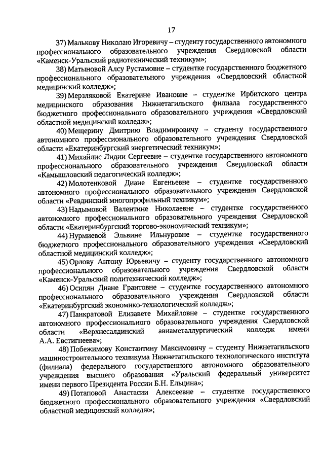 Указ Губернатора Свердловской области от 17.11.2020 N 616-УГ "О назначении стипендий Губернатора Свердловской области обучающимся по очной форме обучения по образовательным программам высшего образования - программам бакалавриата, специалитета, магистратуры, подготовки научно-педагогических кадров в аспирантуре (адъюнктуре), ординатуры, ассистентуры-стажировки, имеющим государственную аккредитацию, образовательным программам среднего профессионального образования - программам подготовки специалистов среднего звена, имеющим государственную аккредитацию, в 2020 году"
