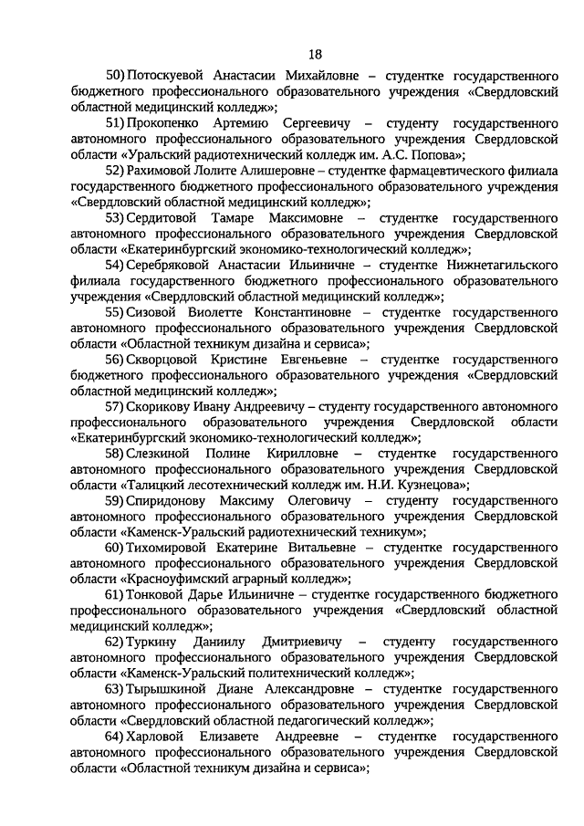Указ Губернатора Свердловской области от 17.11.2020 N 616-УГ "О назначении стипендий Губернатора Свердловской области обучающимся по очной форме обучения по образовательным программам высшего образования - программам бакалавриата, специалитета, магистратуры, подготовки научно-педагогических кадров в аспирантуре (адъюнктуре), ординатуры, ассистентуры-стажировки, имеющим государственную аккредитацию, образовательным программам среднего профессионального образования - программам подготовки специалистов среднего звена, имеющим государственную аккредитацию, в 2020 году"