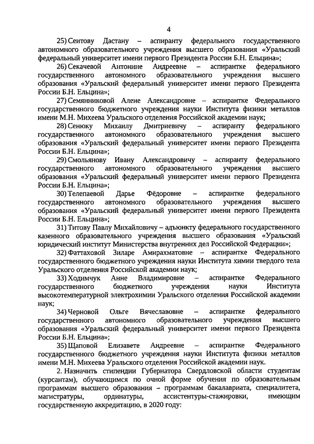 Указ Губернатора Свердловской области от 17.11.2020 N 616-УГ "О назначении стипендий Губернатора Свердловской области обучающимся по очной форме обучения по образовательным программам высшего образования - программам бакалавриата, специалитета, магистратуры, подготовки научно-педагогических кадров в аспирантуре (адъюнктуре), ординатуры, ассистентуры-стажировки, имеющим государственную аккредитацию, образовательным программам среднего профессионального образования - программам подготовки специалистов среднего звена, имеющим государственную аккредитацию, в 2020 году"