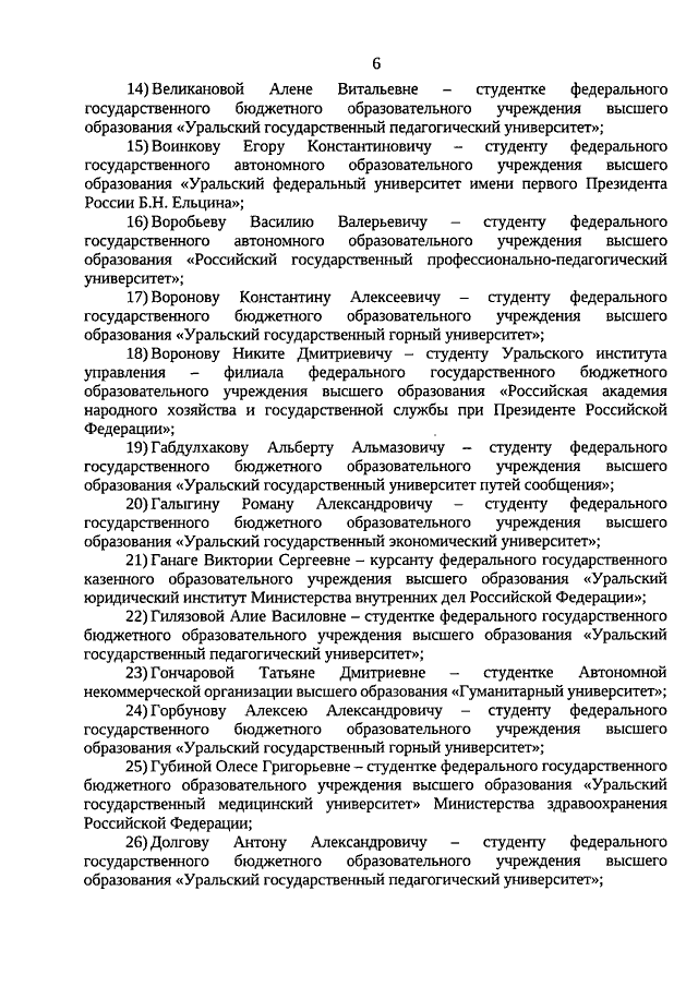 Указ Губернатора Свердловской области от 17.11.2020 N 616-УГ "О назначении стипендий Губернатора Свердловской области обучающимся по очной форме обучения по образовательным программам высшего образования - программам бакалавриата, специалитета, магистратуры, подготовки научно-педагогических кадров в аспирантуре (адъюнктуре), ординатуры, ассистентуры-стажировки, имеющим государственную аккредитацию, образовательным программам среднего профессионального образования - программам подготовки специалистов среднего звена, имеющим государственную аккредитацию, в 2020 году"