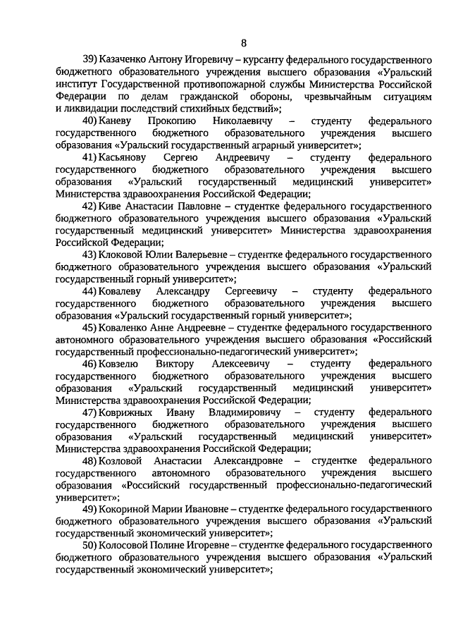 Указ Губернатора Свердловской области от 17.11.2020 N 616-УГ "О назначении стипендий Губернатора Свердловской области обучающимся по очной форме обучения по образовательным программам высшего образования - программам бакалавриата, специалитета, магистратуры, подготовки научно-педагогических кадров в аспирантуре (адъюнктуре), ординатуры, ассистентуры-стажировки, имеющим государственную аккредитацию, образовательным программам среднего профессионального образования - программам подготовки специалистов среднего звена, имеющим государственную аккредитацию, в 2020 году"