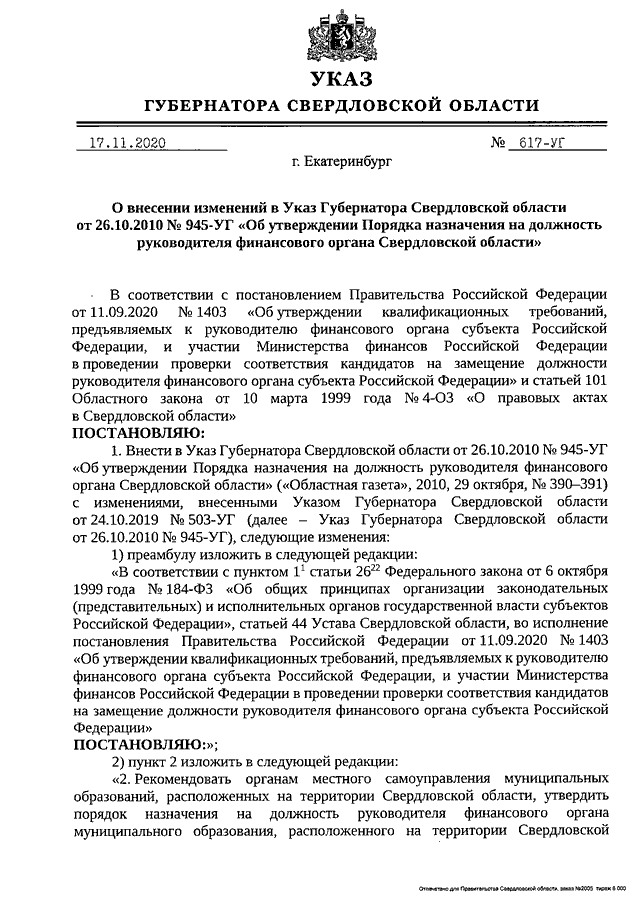 Указ Губернатора Свердловской области от 17.11.2020 N 617-УГ "О внесении изменений в Указ Губернатора Свердловской области от 26.10.2010 N 945-УГ "Об утверждении Порядка назначения на должность руководителя финансового органа Свердловской области"