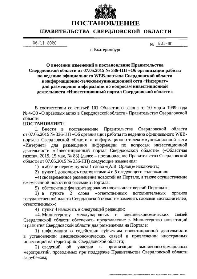 Постановление Правительства Свердловской области от 06.11.2020 N 801-ПП "О внесении изменений в постановление Правительства Свердловской области от 07.05.2015 N 336-ПП "Об организации работы по ведению официального WEB-портала Свердловской области в информационно-телекоммуникационной сети "Интернет" для размещения информации по вопросам инвестиционной деятельности "Инвестиционный портал Свердловской области"