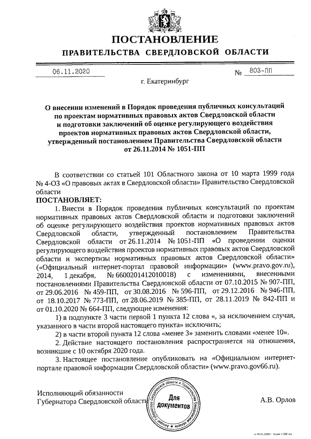 Постановление Правительства Свердловской области от 06.11.2020 N 803-ПП "О внесении изменений в Порядок проведения публичных консультаций по проектам нормативных правовых актов Свердловской области и подготовки заключений об оценке регулирующего воздействия проектов нормативных правовых актов Свердловской области, утвержденный постановлением Правительства Свердловской области от 26.11.2014 N 1051-ПП"