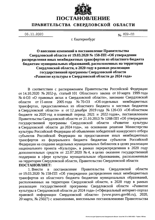 Постановление Правительства Свердловской области от 06.11.2020 N 809-ПП "О внесении изменений в постановление Правительства Свердловской области от 19.03.2020 N 158-ПП "Об утверждении распределения иных межбюджетных трансфертов из областного бюджета бюджетам муниципальных образований, расположенных на территории Свердловской области, в 2020 году в рамках реализации государственной программы Свердловской области "Развитие культуры в Свердловской области до 2024 года"