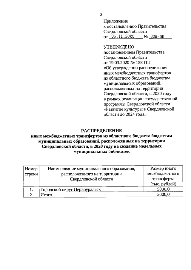 Постановление Правительства Свердловской области от 06.11.2020 N 809-ПП "О внесении изменений в постановление Правительства Свердловской области от 19.03.2020 N 158-ПП "Об утверждении распределения иных межбюджетных трансфертов из областного бюджета бюджетам муниципальных образований, расположенных на территории Свердловской области, в 2020 году в рамках реализации государственной программы Свердловской области "Развитие культуры в Свердловской области до 2024 года"
