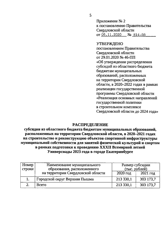 Постановление Правительства Свердловской области от 06.11.2020 N 814-ПП "О внесении изменений в постановление Правительства Свердловской области от 29.01.2020 N 46-ПП "Об утверждении распределения субсидий из областного бюджета бюджетам муниципальных образований, расположенных на территории Свердловской области, в 2020 - 2022 годах в рамках реализации государственной программы Свердловской области "Реализация основных направлений государственной политики в строительном комплексе Свердловской области до 2024 года"