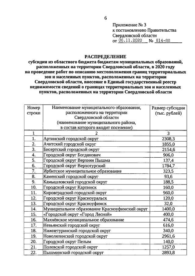 Постановление Правительства Свердловской области от 06.11.2020 N 814-ПП "О внесении изменений в постановление Правительства Свердловской области от 29.01.2020 N 46-ПП "Об утверждении распределения субсидий из областного бюджета бюджетам муниципальных образований, расположенных на территории Свердловской области, в 2020 - 2022 годах в рамках реализации государственной программы Свердловской области "Реализация основных направлений государственной политики в строительном комплексе Свердловской области до 2024 года"