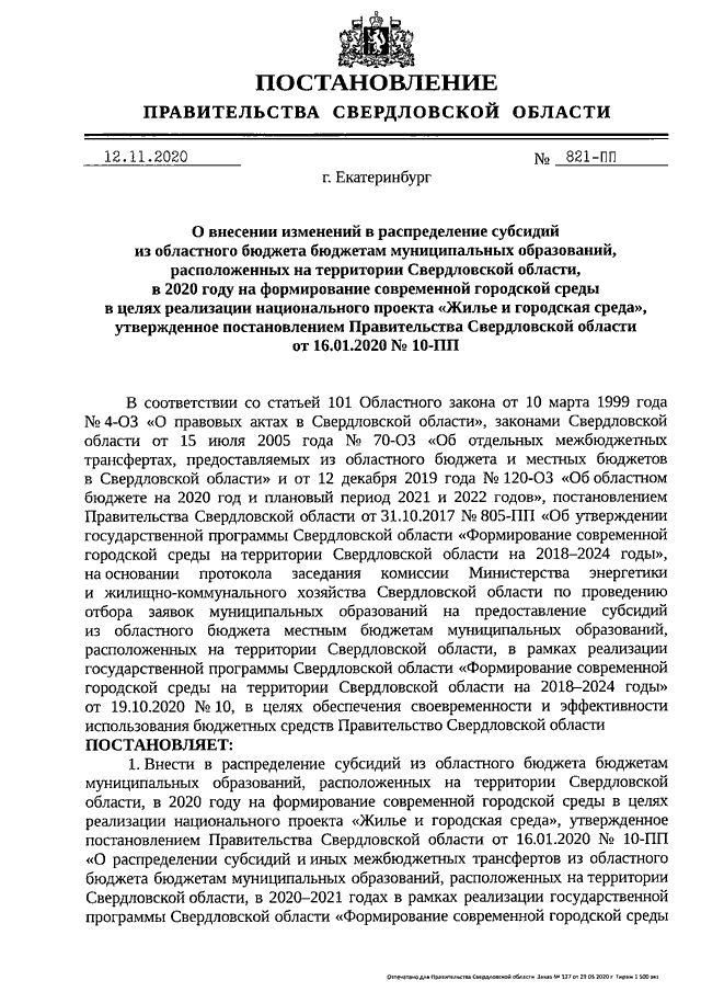 Постановление Правительства Свердловской области от 12.11.2020 N 821-ПП "О внесении изменений в распределение субсидий из областного бюджета бюджетам муниципальных образований, расположенных на территории Свердловской области, в 2020 году на формирование современной городской среды в целях реализации национального проекта "Жилье и городская среда", утвержденное постановлением Правительства Свердловской области от 16.01.2020 N 10-ПП"
