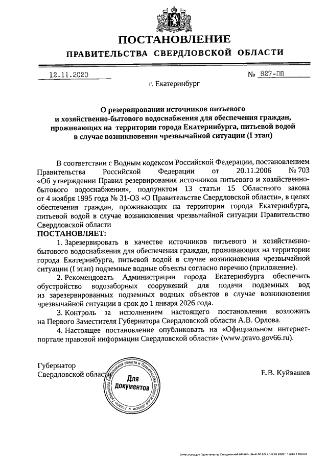 Постановление Правительства Свердловской области от 12.11.2020 N 827-ПП "О резервировании источников питьевого и хозяйственно-бытового водоснабжения для обеспечения граждан, проживающих на территории города Екатеринбурга, питьевой водой в случае возникновения чрезвычайной ситуации (I этап)"