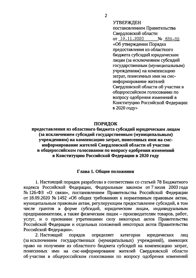 Постановление Правительства Свердловской области от 19.11.2020 N 839-ПП "Об утверждении Порядка предоставления из областного бюджета субсидий юридическим лицам (за исключением субсидий государственным (муниципальным) учреждениям) на компенсацию затрат, понесенных ими на смс-информирование жителей Свердловской области об участии в общероссийском голосовании по вопросу одобрения изменений в Конституцию Российской Федерации в 2020 году"