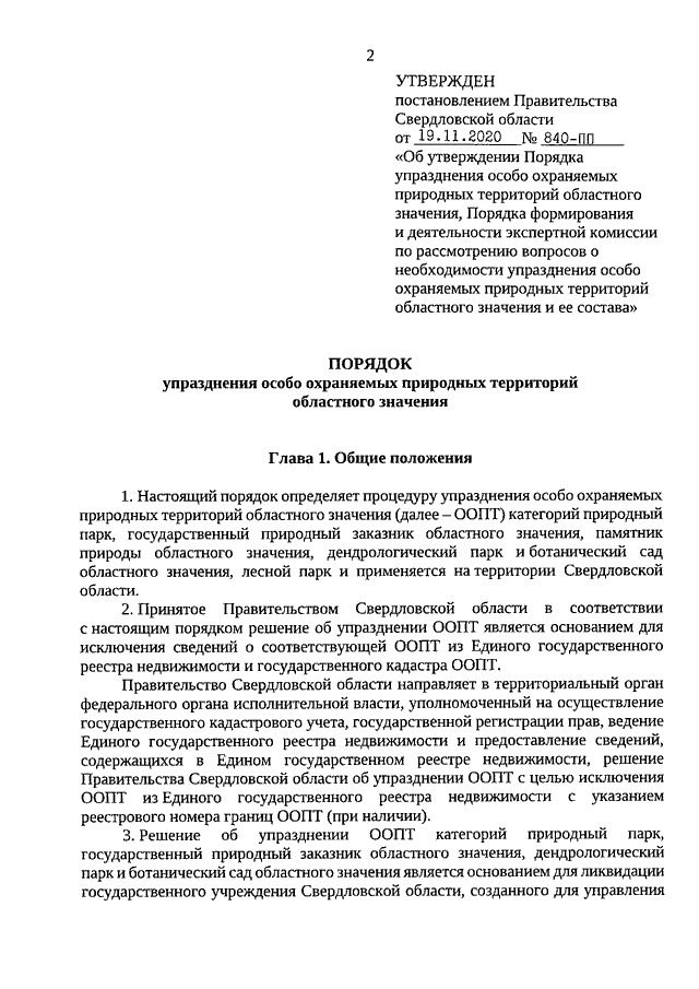 Постановление Правительства Свердловской области от 19.11.2020 N 840-ПП "Об утверждении Порядка упразднения особо охраняемых природных территорий областного значения, Порядка формирования и деятельности экспертной комиссии по рассмотрению вопросов о необходимости упразднения особо охраняемых природных территорий областного значения и ее состава"