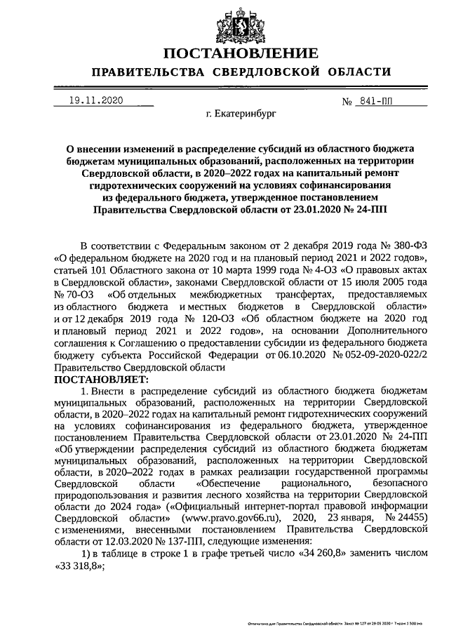 Постановление Правительства Свердловской области от 19.11.2020 N 841-ПП "О внесении изменений в распределение субсидий из областного бюджета бюджетам муниципальных образований, расположенных на территории Свердловской области, в 2020 - 2022 годах на капитальный ремонт гидротехнических сооружений на условиях софинансирования из федерального бюджета, утвержденное постановлением Правительства Свердловской области от 23.01.2020 N 24-ПП"