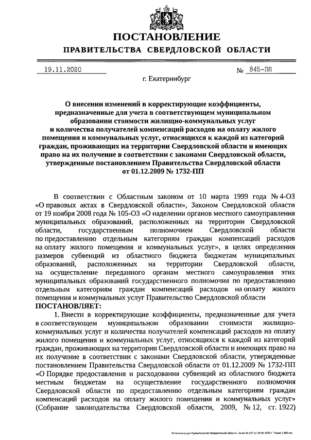 Постановление Правительства Свердловской области от 19.11.2020 N 845-ПП "О внесении изменений в корректирующие коэффициенты, предназначенные для учета в соответствующем муниципальном образовании стоимости жилищно-коммунальных услуг и количества получателей компенсаций расходов на оплату жилого помещения и коммунальных услуг, относящихся к каждой из категорий граждан, проживающих на территории Свердловской области и имеющих право на их получение в соответствии с законами Свердловской области, утвержденные постановлением Правительства Свердловской области от 01.12.2009 N 1732-ПП"