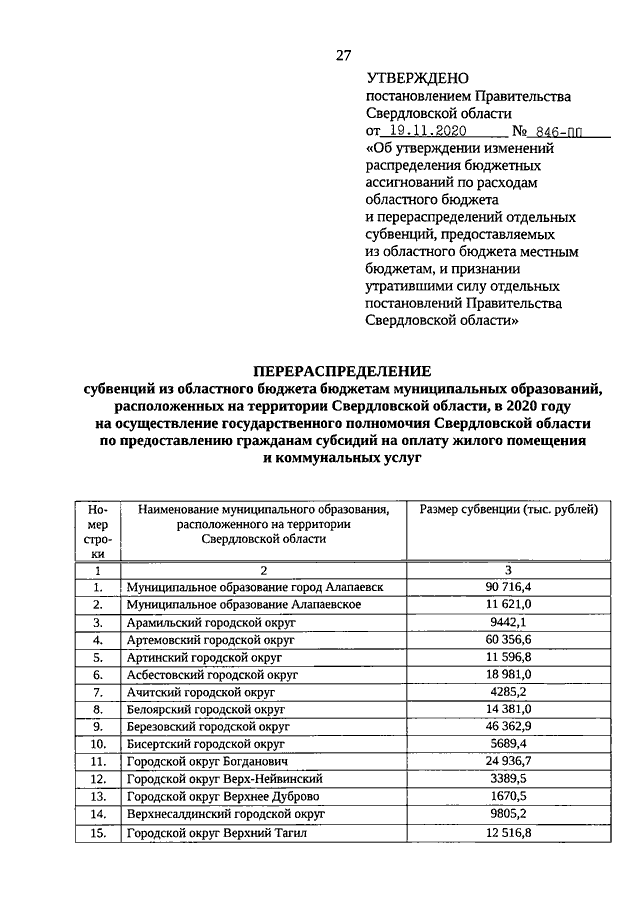 Постановление Правительства Свердловской области от 19.11.2020 N 846-ПП "Об утверждении изменений распределения бюджетных ассигнований по расходам областного бюджета и перераспределений отдельных субвенций, предоставляемых из областного бюджета местным бюджетам, и признании утратившими силу отдельных постановлений Правительства Свердловской области"
