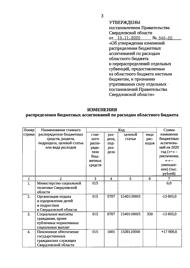 Постановление Правительства Свердловской области от 19.11.2020 N 846-ПП "Об утверждении изменений распределения бюджетных ассигнований по расходам областного бюджета и перераспределений отдельных субвенций, предоставляемых из областного бюджета местным бюджетам, и признании утратившими силу отдельных постановлений Правительства Свердловской области"