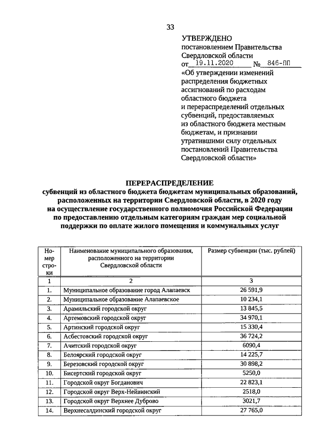 Постановление Правительства Свердловской области от 19.11.2020 N 846-ПП "Об утверждении изменений распределения бюджетных ассигнований по расходам областного бюджета и перераспределений отдельных субвенций, предоставляемых из областного бюджета местным бюджетам, и признании утратившими силу отдельных постановлений Правительства Свердловской области"