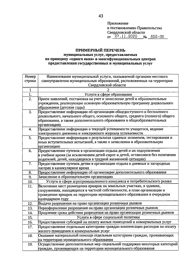 Постановление Правительства Свердловской области от 27.11.2020 N 852-ПП "О государственных услугах, предоставляемых исполнительными органами государственной власти Свердловской области, территориальными государственными внебюджетными фондами Свердловской области в государственном бюджетном учреждении Свердловской области "Многофункциональный центр предоставления государственных и муниципальных услуг", в том числе посредством комплексного запроса, примерном перечне муниципальных услуг, предоставляемых по принципу "одного окна" в многофункциональных центрах предоставления государственных и муниципальных услуг, и признании утратившим силу постановления Правительства Свердловской области от 25.09.2013 N 1159-ПП "О перечне государственных услуг, предоставляемых органами государственной власти Свердловской области, территориальными государственными внебюджетными фондами Свердловской области в государственном бюджетном учреждении Свердловской области "Многофункциональный центр предоставления государственных и муниципальных услуг"