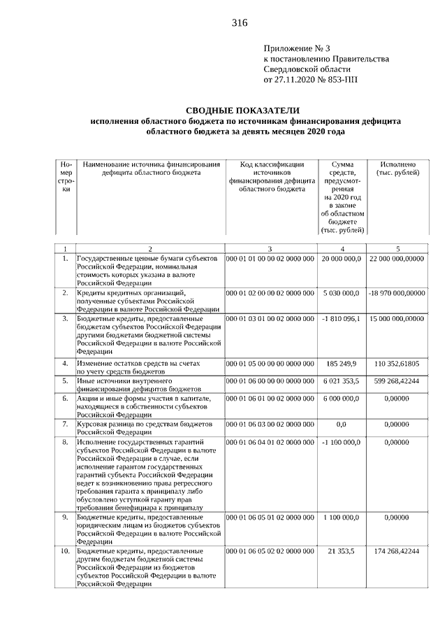Постановление Правительства Свердловской области от 27.11.2020 N 853-ПП "Об отчете об исполнении областного бюджета за девять месяцев 2020 года"