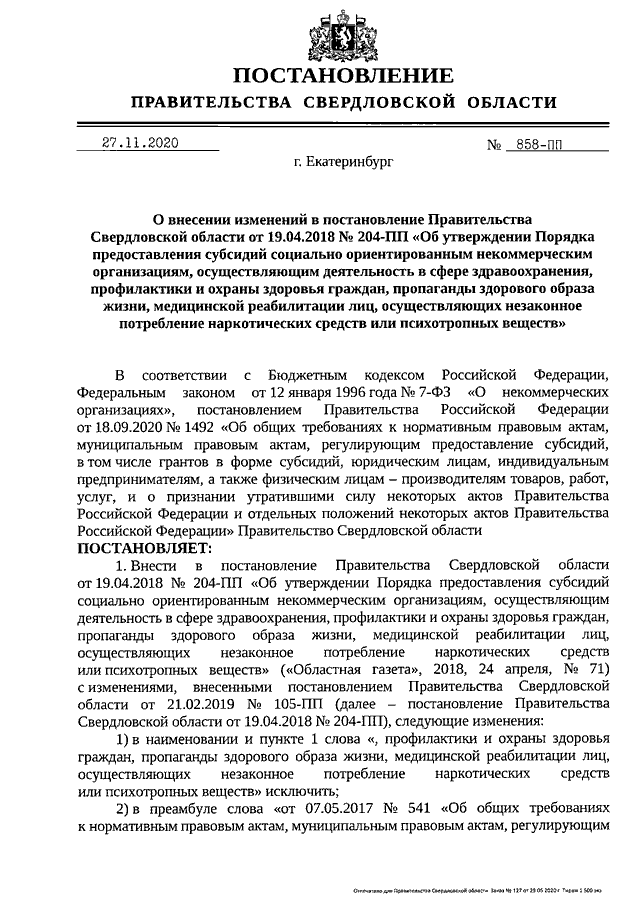 Постановление Правительства Свердловской области от 27.11.2020 N 858-ПП "О внесении изменений в постановление Правительства Свердловской области от 19.04.2018 N 204-ПП "Об утверждении Порядка предоставления субсидий социально ориентированным некоммерческим организациям, осуществляющим деятельность в сфере здравоохранения, профилактики и охраны здоровья граждан, пропаганды здорового образа жизни, медицинской реабилитации лиц, осуществляющих незаконное потребление наркотических средств или психотропных веществ"