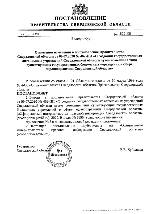 Постановление Правительства Свердловской области от 27.11.2020 N 859-ПП "О внесении изменений в постановление Правительства Свердловской области от 09.07.2020 N 462-ПП "О создании государственных автономных учреждений Свердловской области путем изменения типа существующих государственных бюджетных учреждений в сфере здравоохранения Свердловской области"