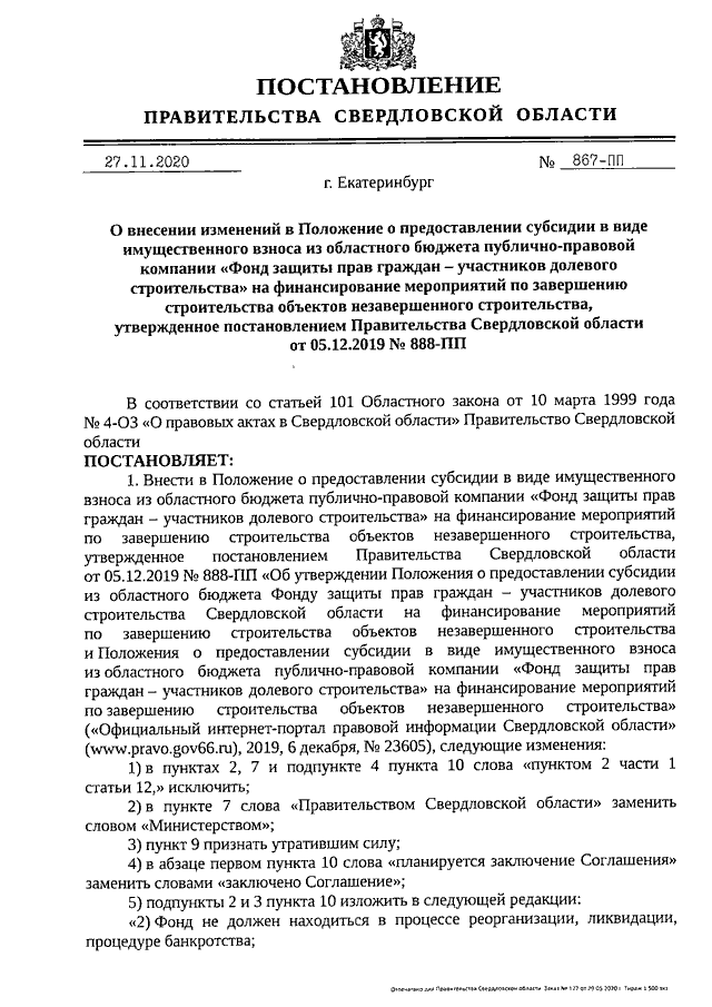 Постановление Правительства Свердловской области от 27.11.2020 N 867-ПП "О внесении изменений в Положение о предоставлении субсидии в виде имущественного взноса из областного бюджета публично-правовой компании "Фонд защиты прав граждан - участников долевого строительства" на финансирование мероприятий по завершению строительства объектов незавершенного строительства, утвержденное постановлением Правительства Свердловской области от 05.12.2019 N 888-ПП"