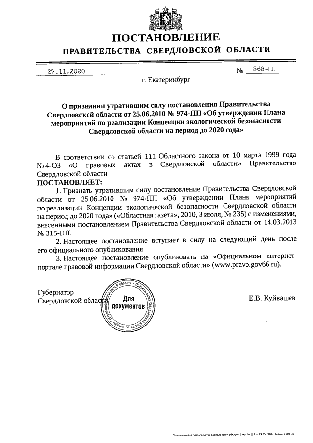 Постановление Правительства Свердловской области от 27.11.2020 N 868-ПП "О признании утратившим силу постановления Правительства Свердловской области от 25.06.2010 N 974-ПП "Об утверждении Плана мероприятий по реализации Концепции экологической безопасности Свердловской области на период до 2020 года"