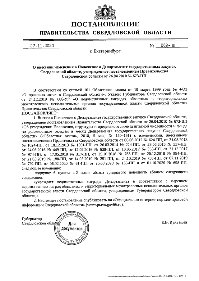 Постановление Правительства Свердловской области от 27.11.2020 N 869-ПП "О внесении изменения в Положение о Департаменте государственных закупок Свердловской области, утвержденное постановлением Правительства Свердловской области от 26.04.2010 N 673-ПП"